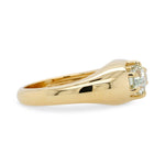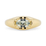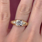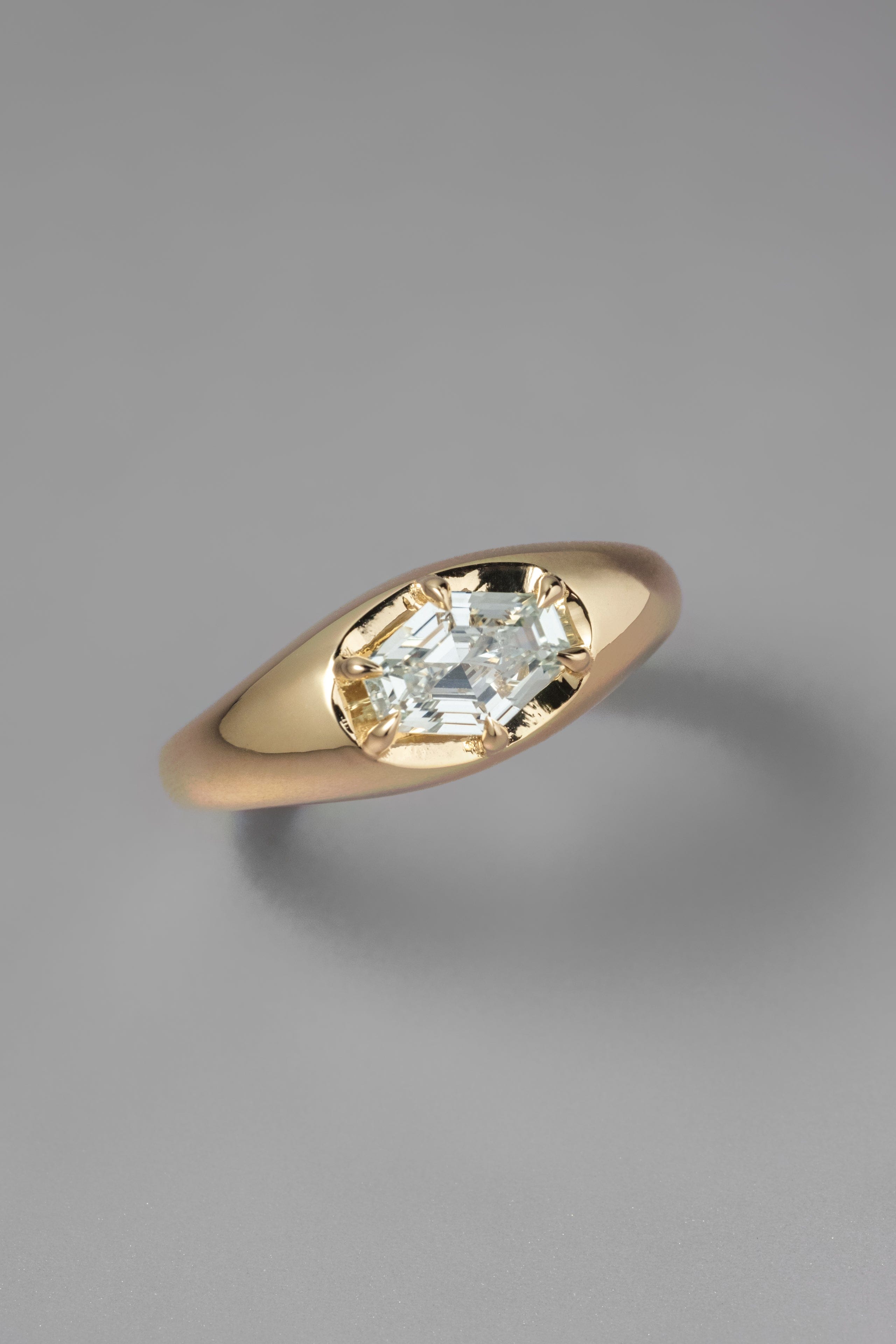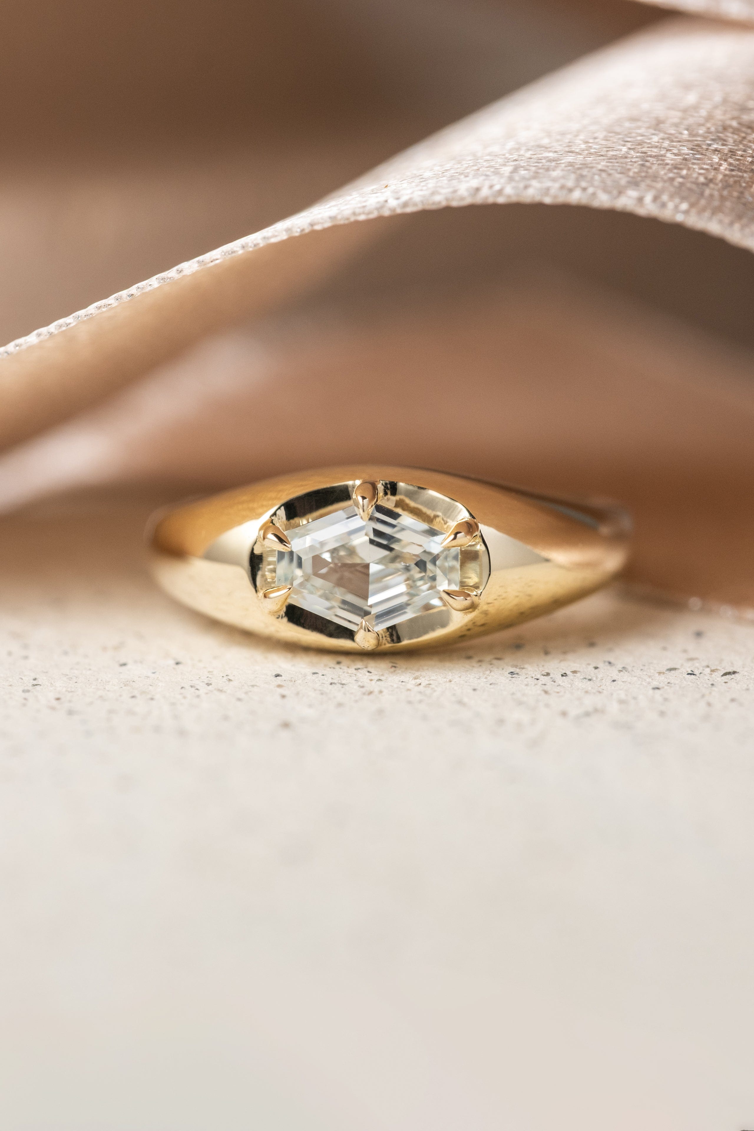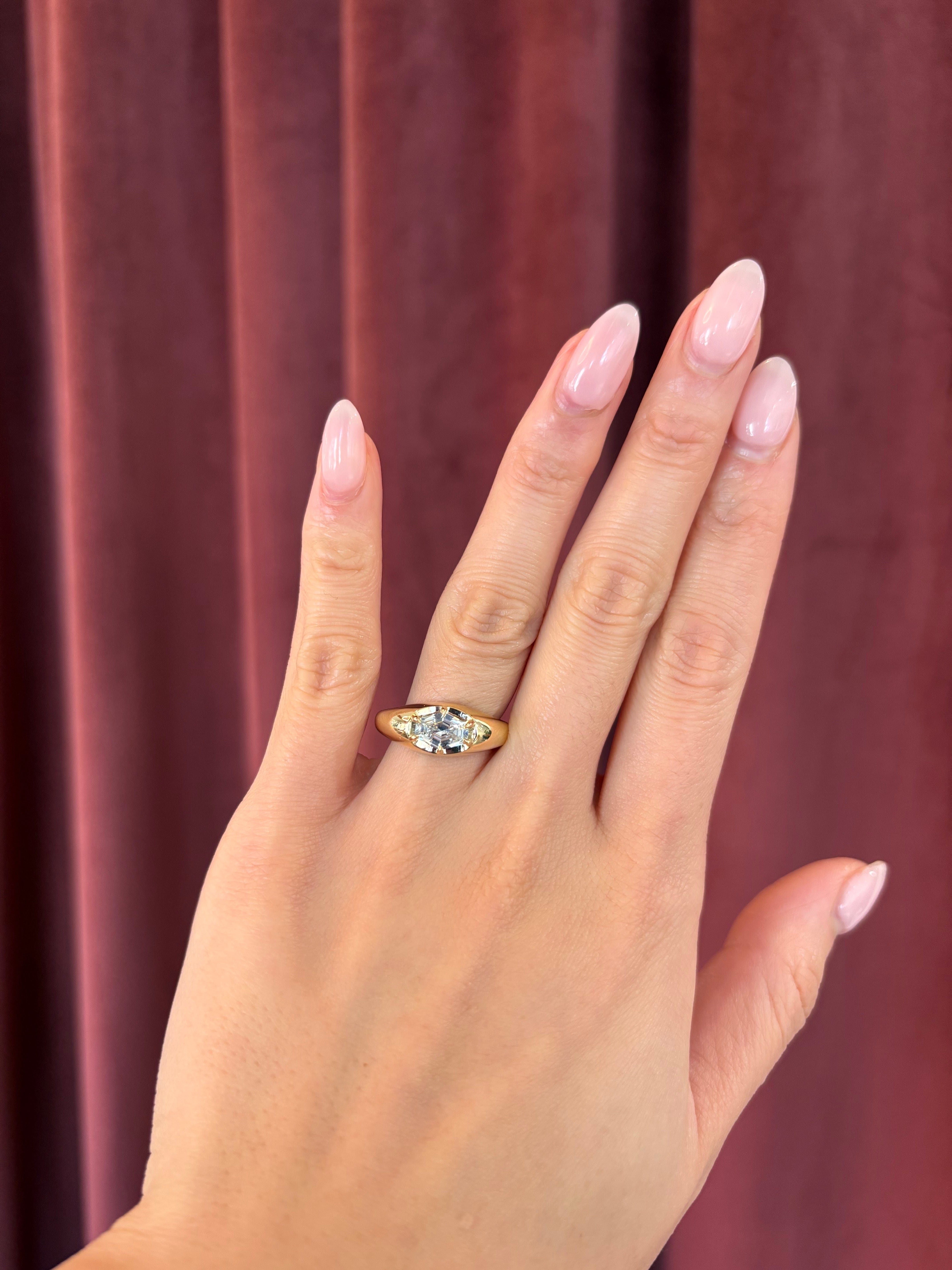 A bold yet refined statement, this hexagon-cut light blue sapphire ring exudes vintage charm with a modern edge. The geometric sapphire, set in a substantial gold signet-style band, catches the light with its crisp faceting and serene blue hue. Designed for those who appreciate unique gemstone cuts and timeless craftsmanship, this ring blends sophistication with everyday wearability.