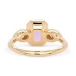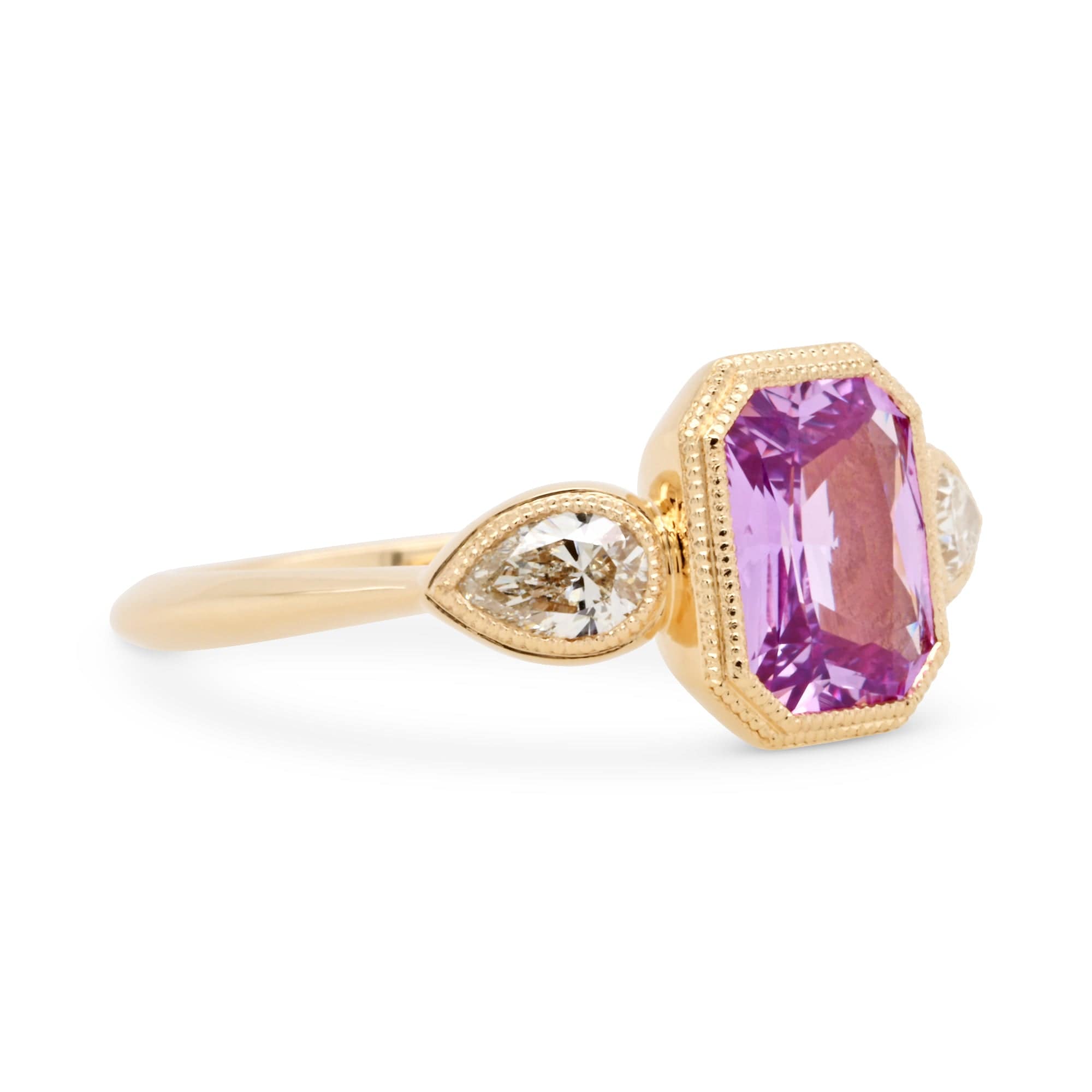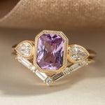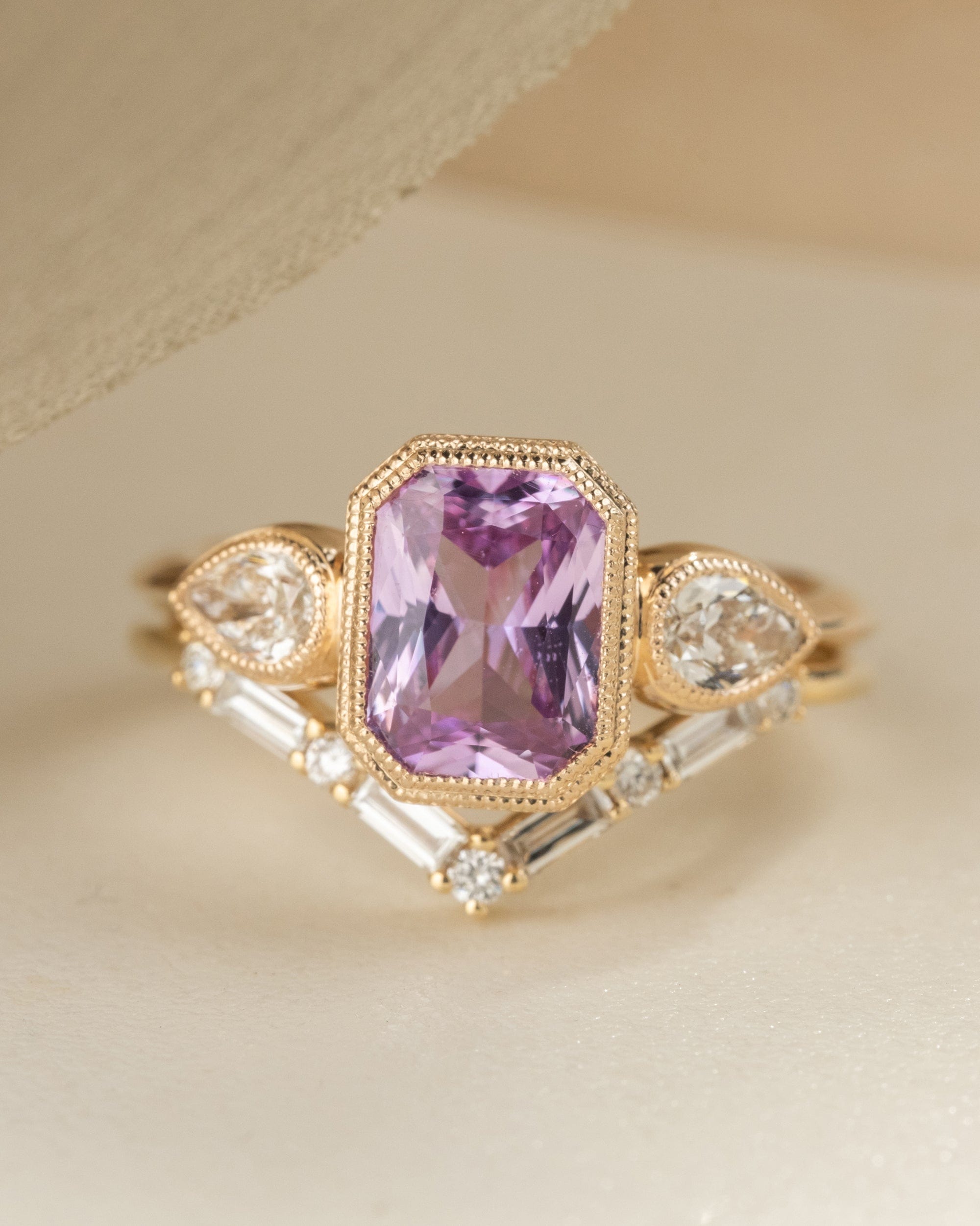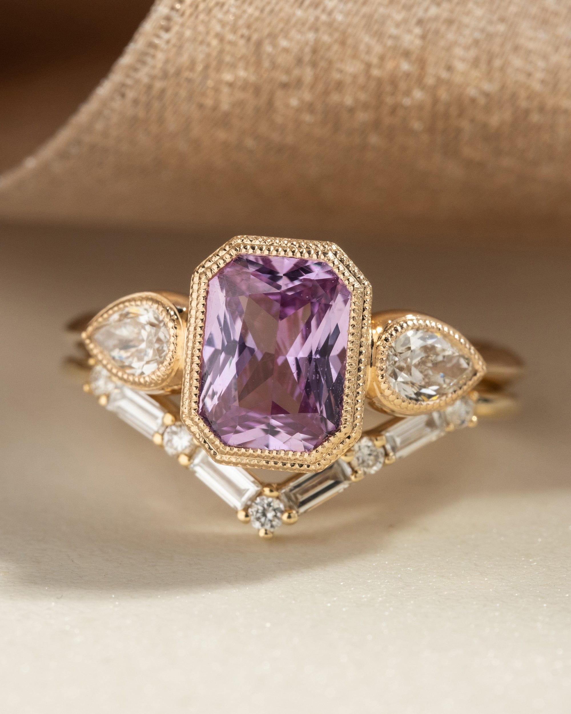 This captivating ring features a radiant lilac sapphire framed by intricate milgrain details done by hand, flanked by two shimmering pear-shaped diamond accents. Set in warm yellow gold, the design feels both bold and feminine, with a vintage-inspired elegance that’s truly one of a kind. Perfect for someone who treasures unique, colorful gemstones paired with timeless sophistication.