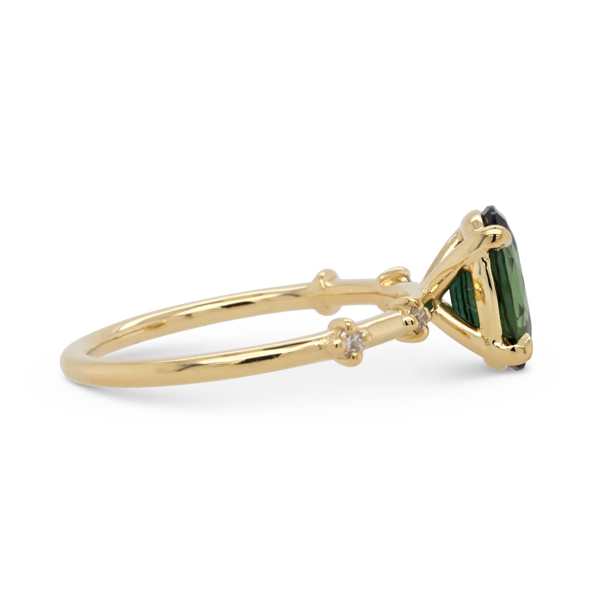 This ring features an oval-cut teal sapphire set in a classic four-prong setting. The rich color of the sapphire is complemented by a polished yellow gold band, creating a clean and modern design with a focus on the natural beauty of the stone.