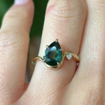 Our Venus setting curves around and cradles a mossy green pear sapphire. Accented with a sparkling white natural diamond, the modern, sculptural setting aims to create movement and an individuality that you will fall in love with over and over again.