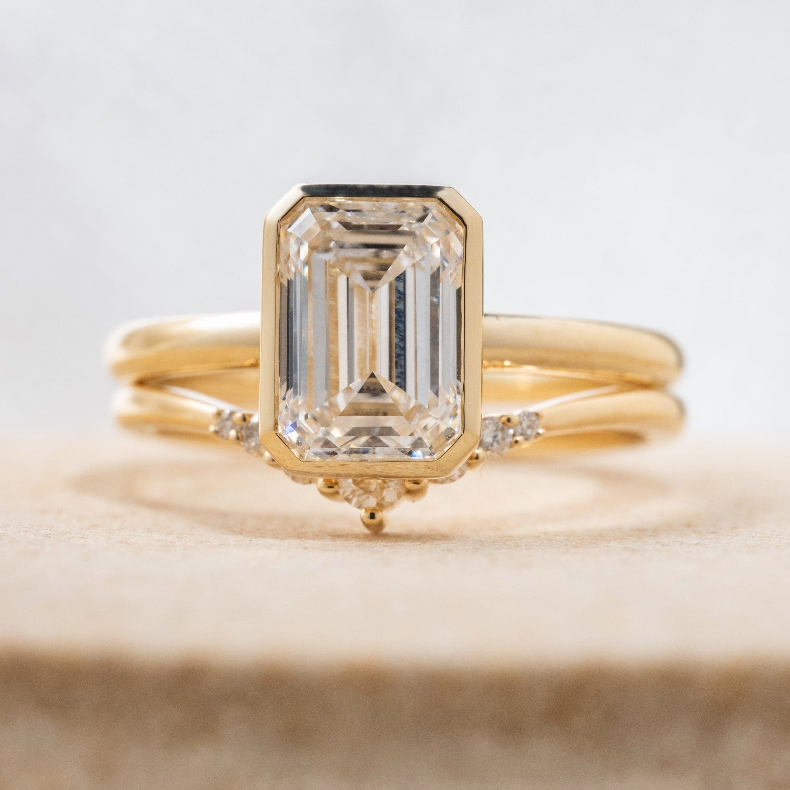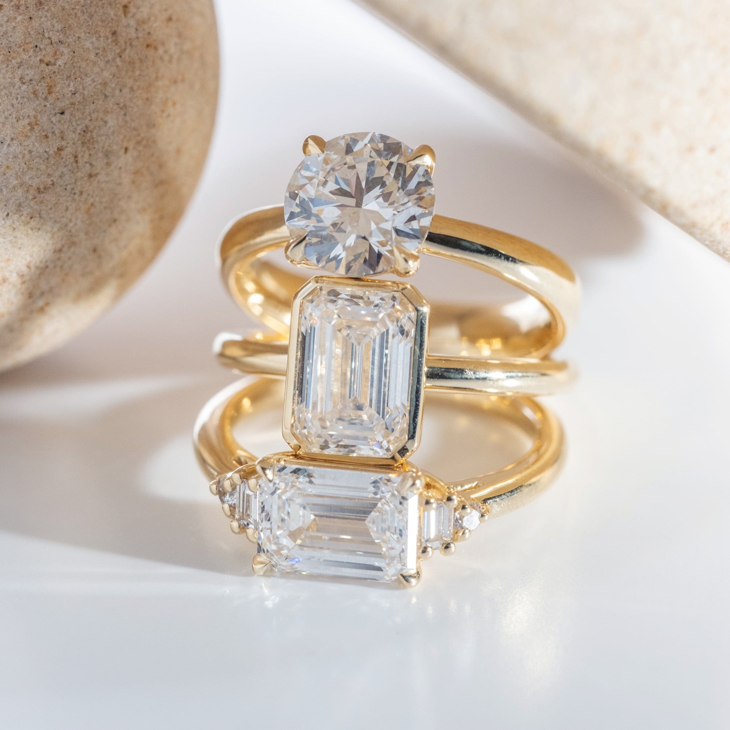 This chic ring features a stunning emerald-cut lab-grown diamond, bezel-set in a sleek yellow gold band for an effortlessly luxe vibe. Beautifully balanced, it’s perfect for the style-savvy romantic who loves a look that’s both fresh and forever.
