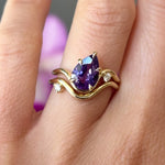 Our Venus setting curves around and cradles a purple sapphire. Accented with a sparkling white natural diamond, the modern, sculptural setting aims to create movement and an individuality that you will fall in love with over and over again.