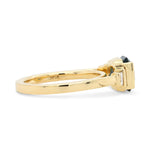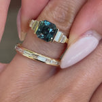 This captivating ring showcases a radiant-cut teal blue sapphire framed in rich yellow gold, exuding modern elegance with a bold pop of color. Flanked by tapered baguette diamonds, it strikes a perfect balance between vintage-inspired glamour and contemporary allure.
