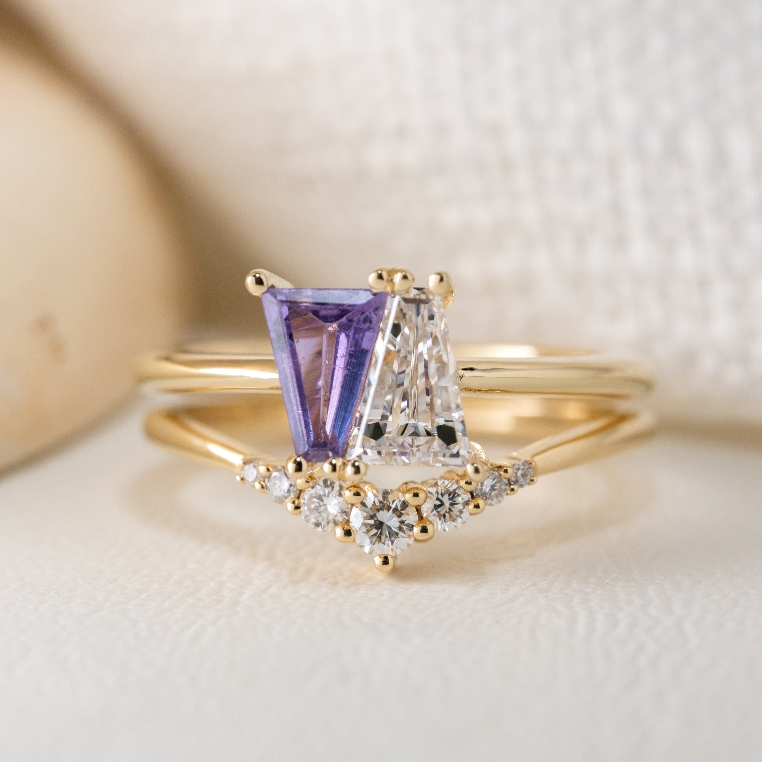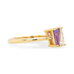 A bold take on symmetry, this ring features a striking pairing of a tapered lilac sapphire and a baguette-cut lab-grown diamond. Set side by side in claw prongs of polished yellow gold, it offers a distinctive, architectural elegance.