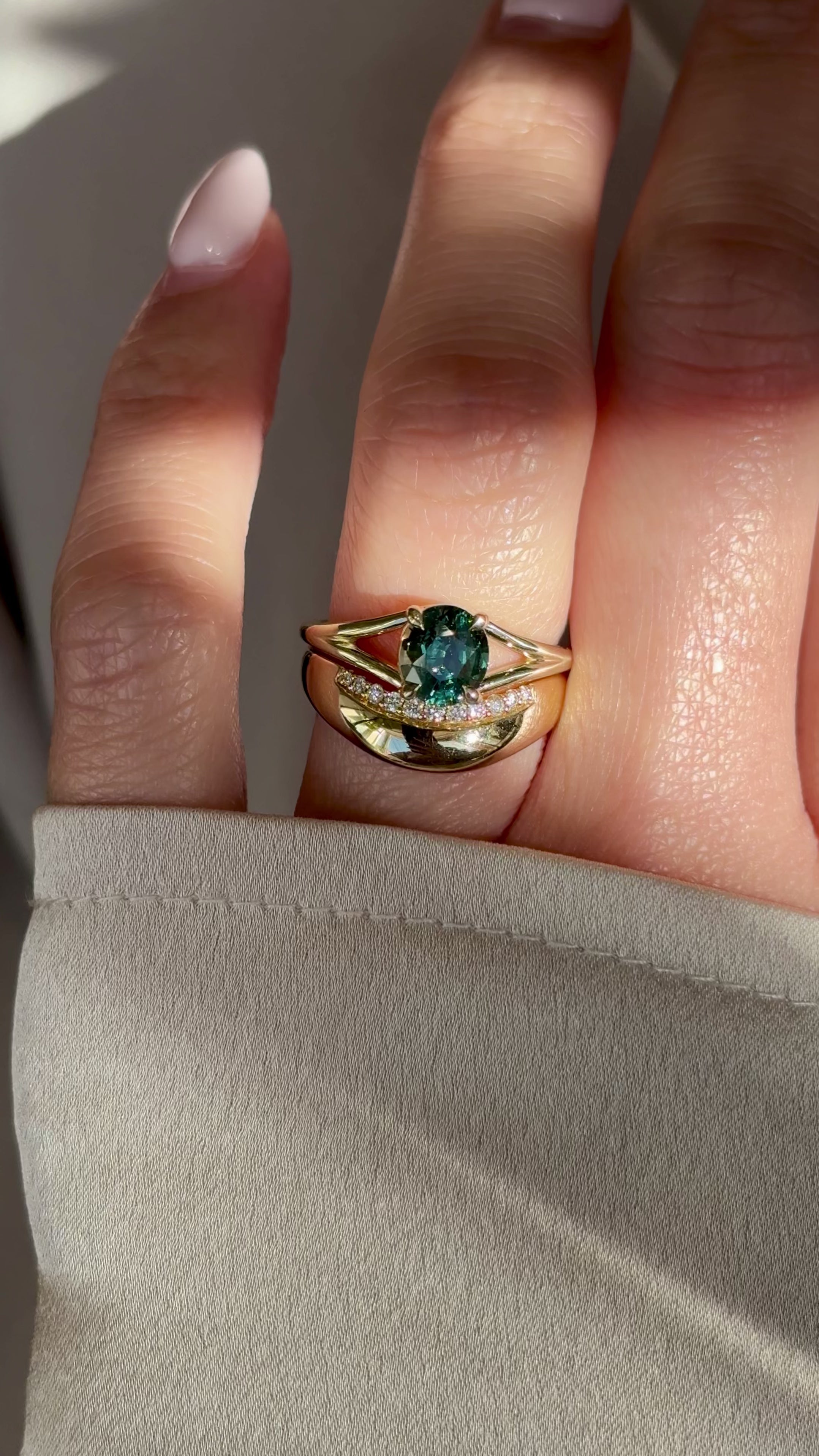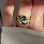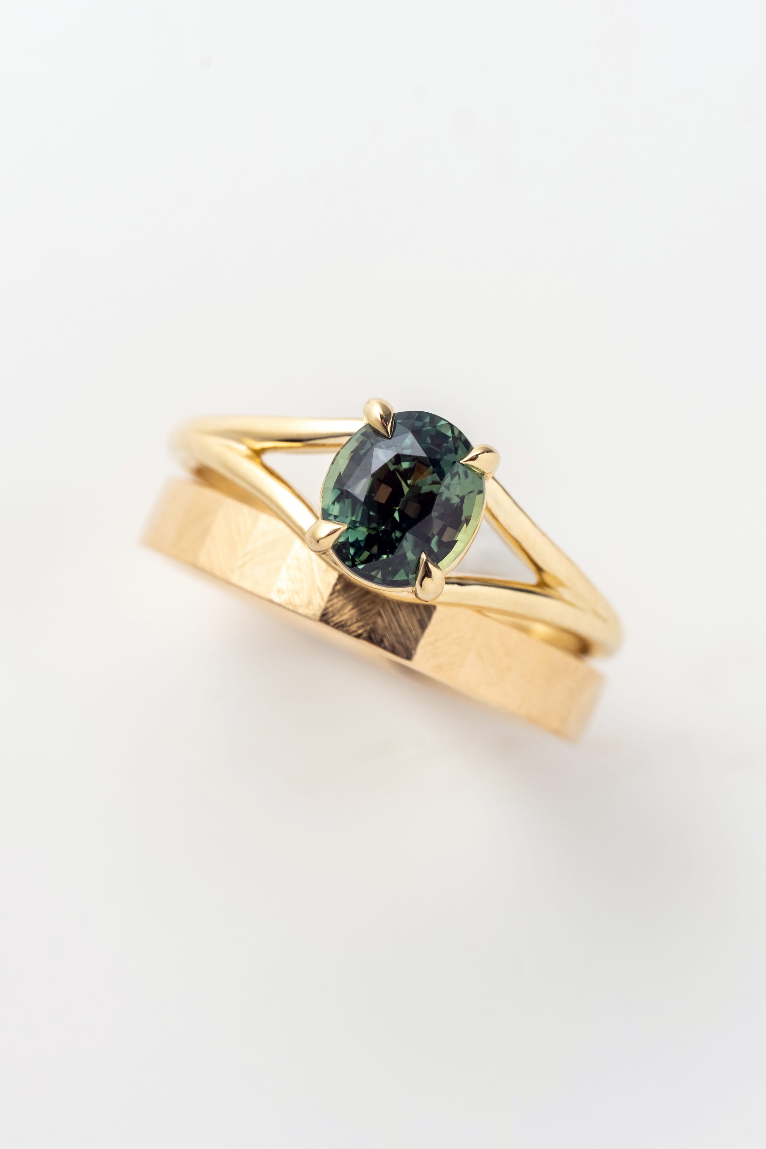 A deep, forest green oval sapphire anchors the Stella, its rich color shifting with depth and dimension as light moves across its surface. Set in four 14K yellow gold prongs, the stone is elevated by a graceful split shank band that parts beneath the stone, creating an elegant, architectural silhouette that feels both modern and timeless. Crafted in solid 14K yellow gold, the warm metal intensifies the earthy, saturated green of the sapphire.