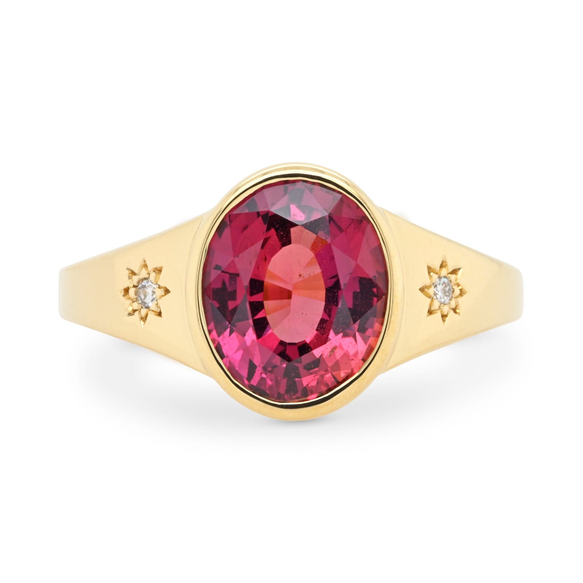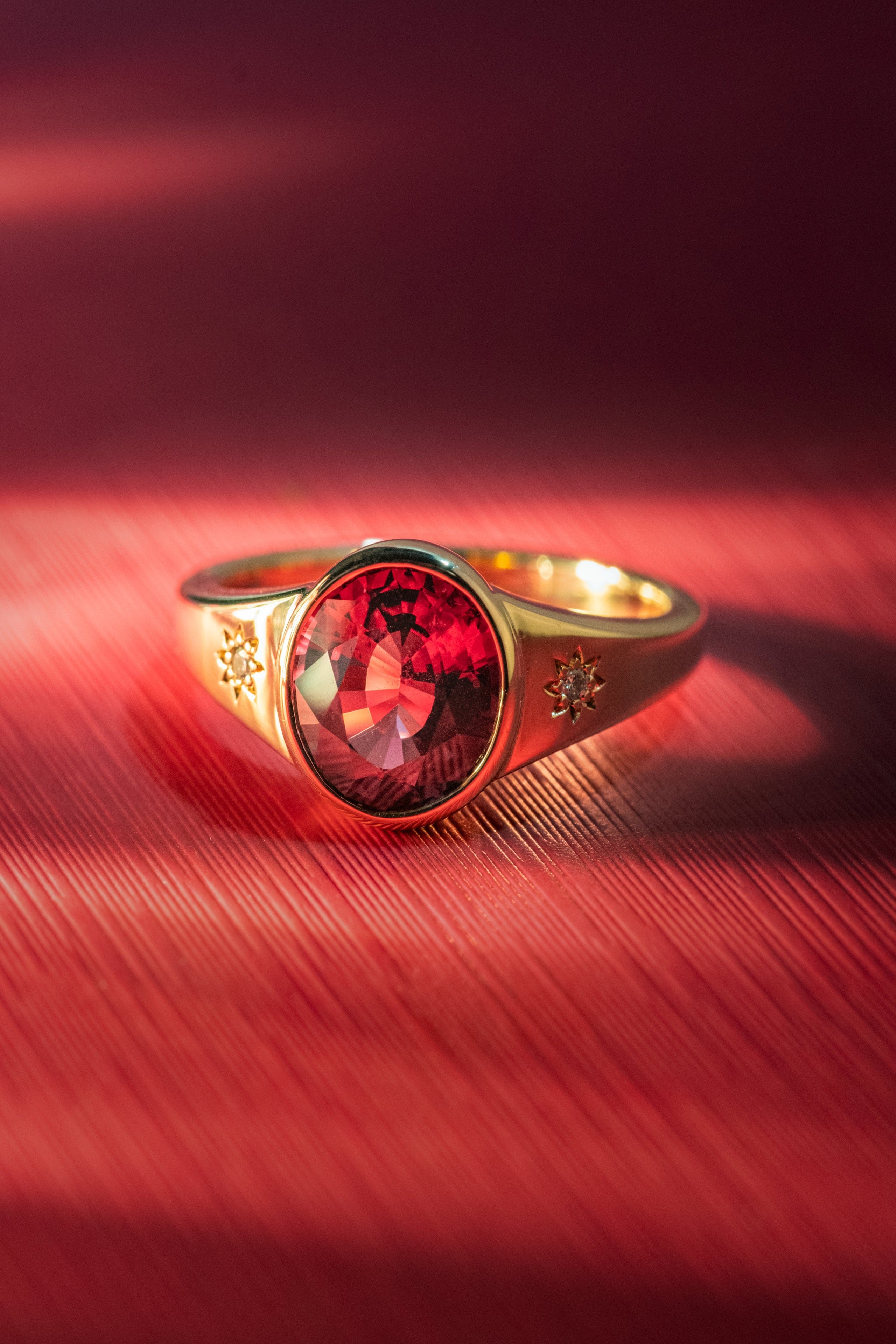 A modern celestial engagement ring featuring a radiant red raspberry natural sapphire, flush-set in polished gold with star diamond accents. Sleek, architectural, and made for any hand.