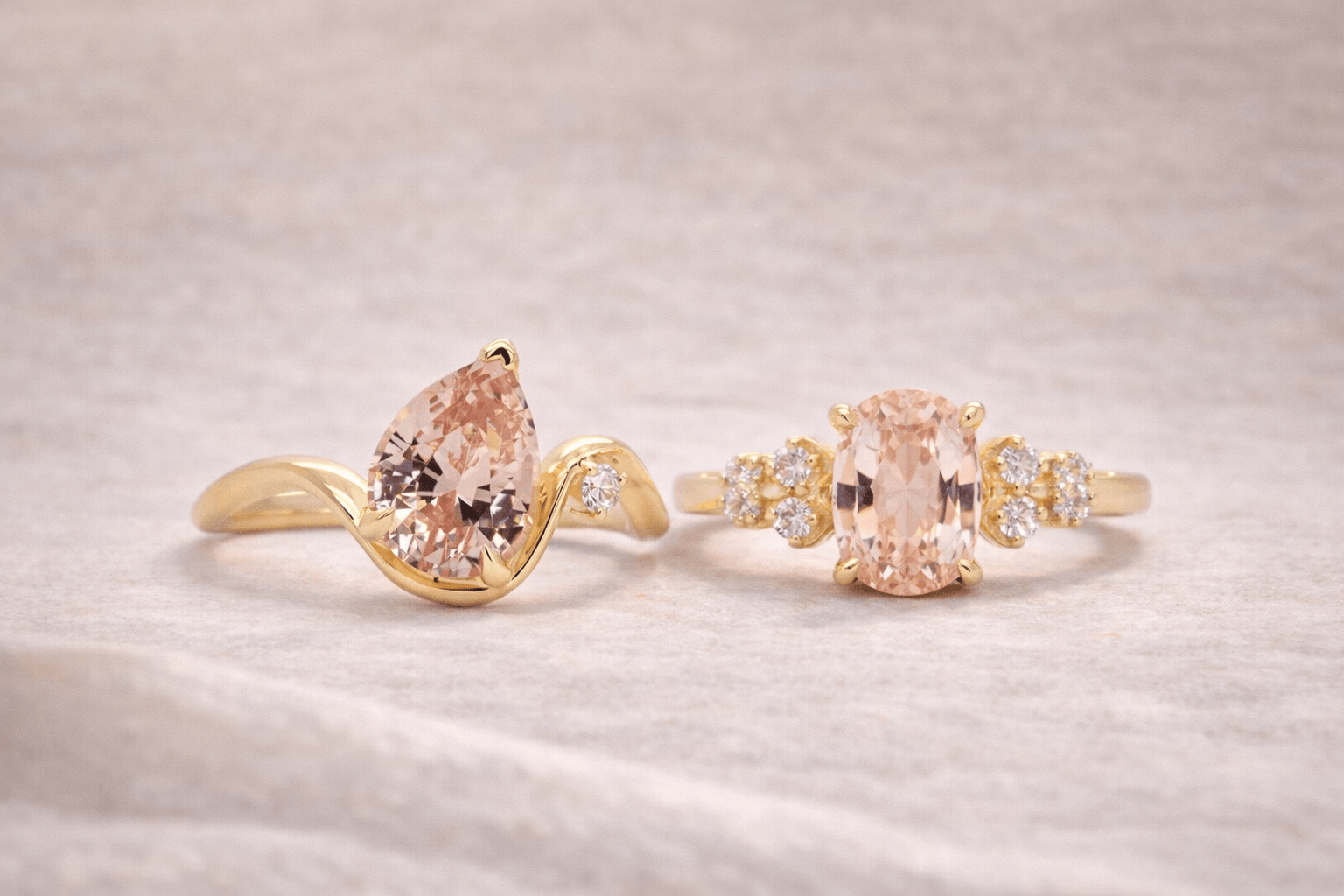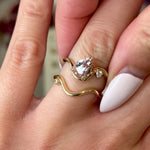 Our Venus setting curves around and cradles a sweet peach sapphire. Accented with a sparkling white natural diamond, the modern, sculptural setting aims to create movement and an individuality that you will fall in love with over and over again.