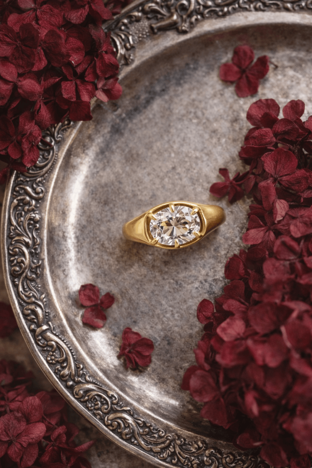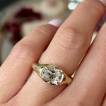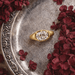 A bold yet refined statement, this antique cushion exudes vintage charm with a modern edge. The classic cut, set in a substantial gold signet-style band, catches the light with its faceted shape. Designed for those who appreciate unique cuts and timeless craftsmanship, this ring blends sophistication with everyday wearability.