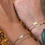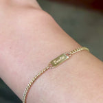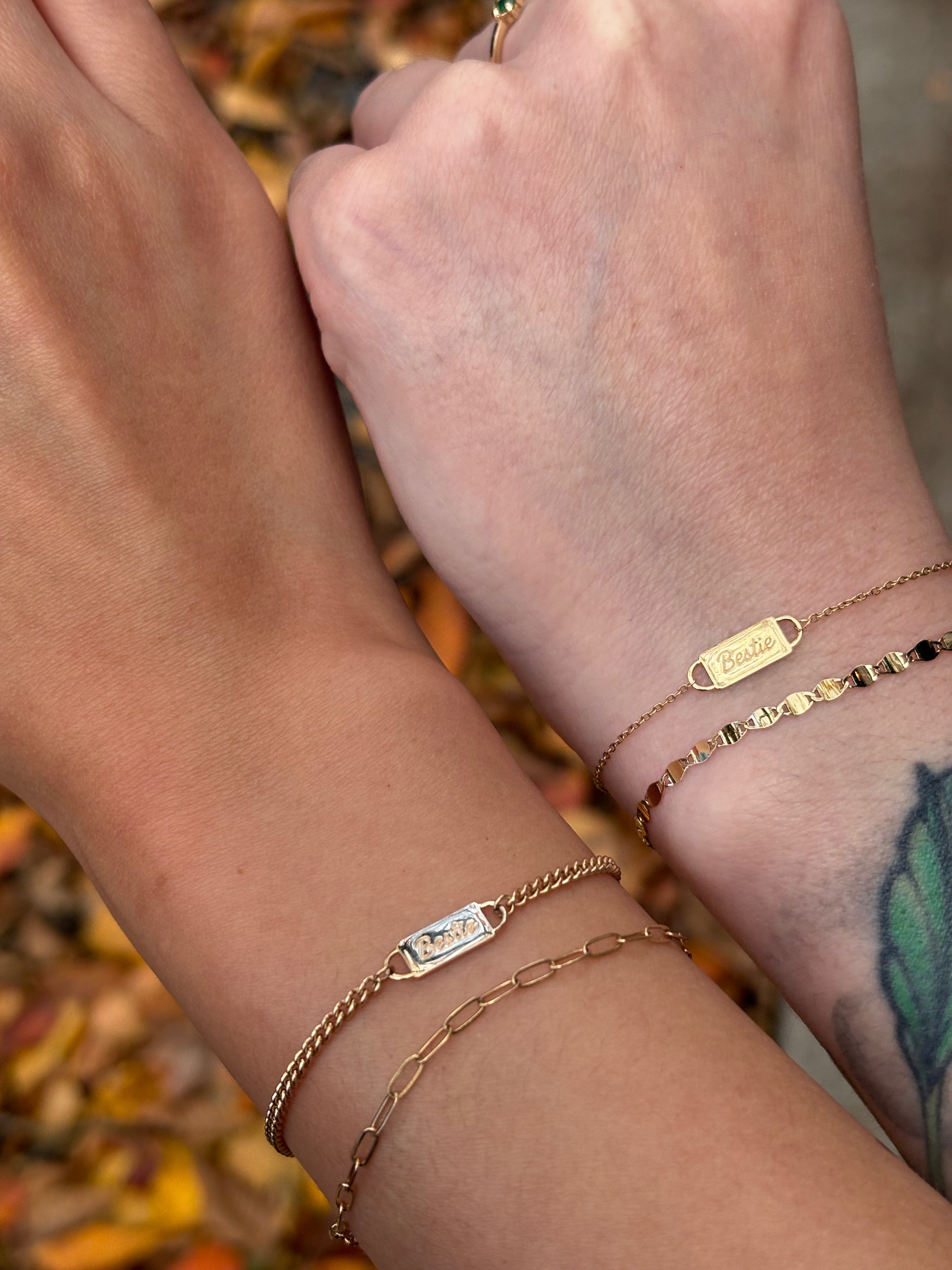 This engravable charm can be worn on a eternity bracelet or add to your own piece! Order with two or more for friends, customize solo or commemorate a furry friend with this stunning solid gold charm. Please note, this charm can be engraved in script or block up to 7 letters - contact us for a custom length charm. Sold as a single charm.