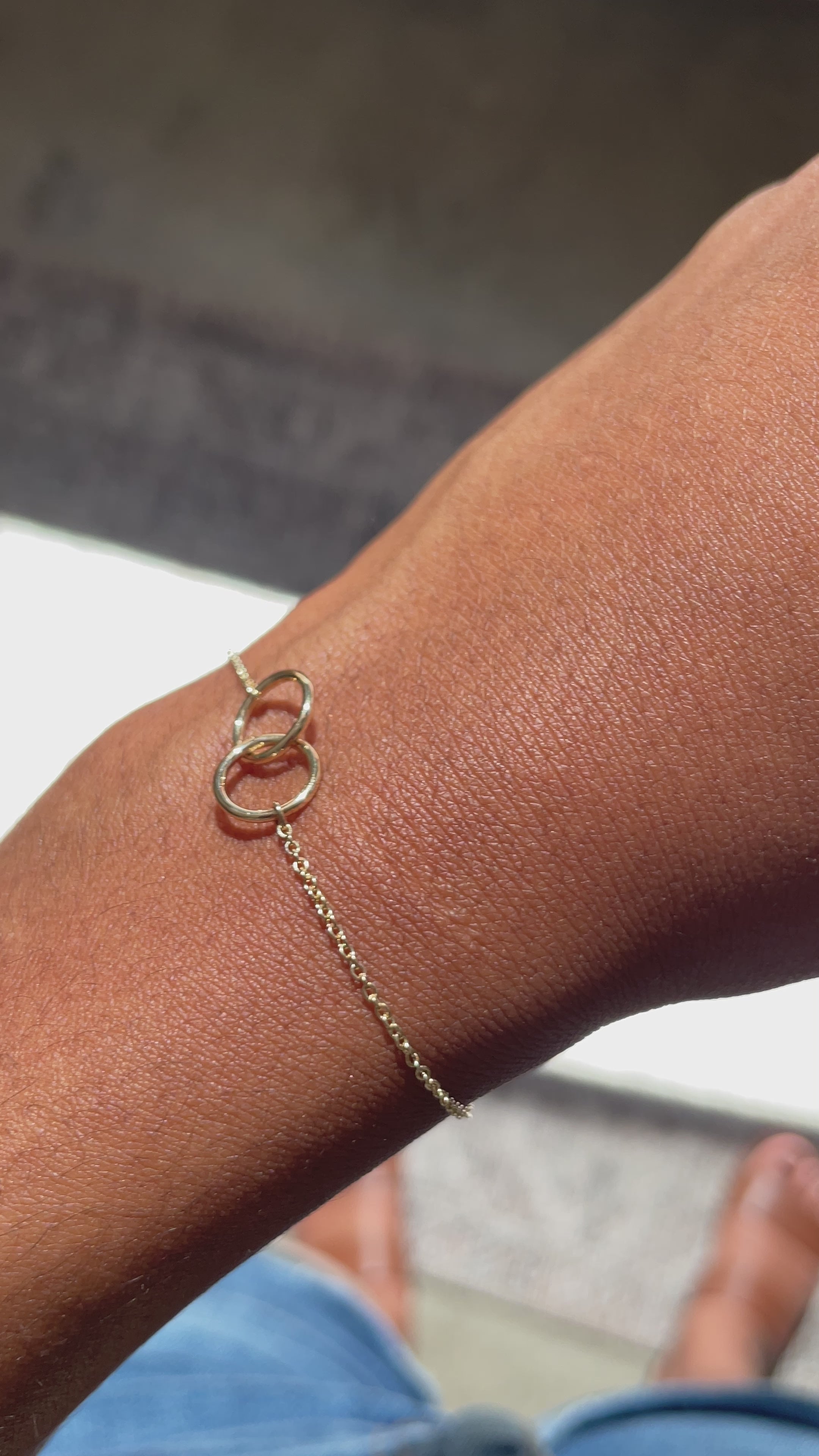 This elegant gold bracelet features two interlocking rings at its center, symbolizing unity and timeless connection. It's a beautiful reminder of the bonds that bring us together.